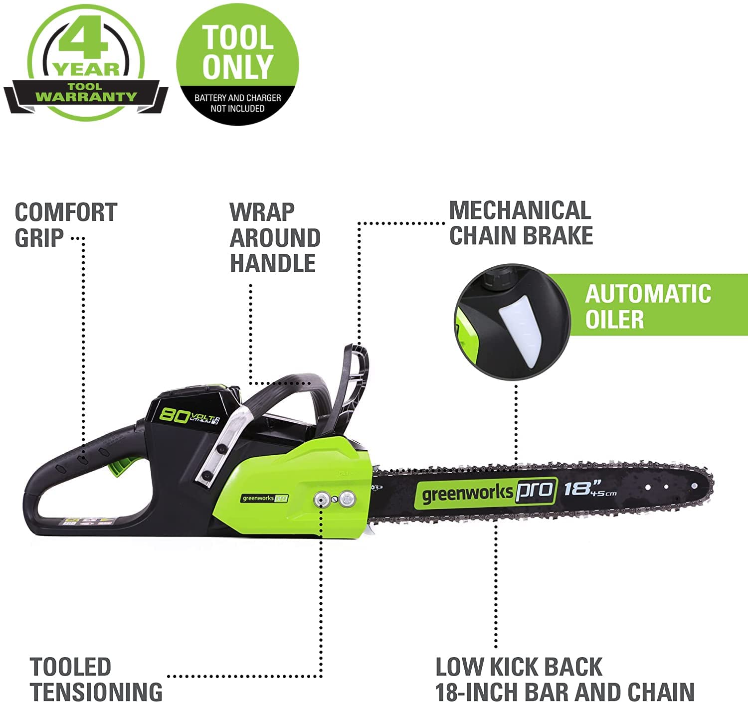 Greenworks 80V 18" cordless chainsaw, brushless, heavy-duty cutting, tool only