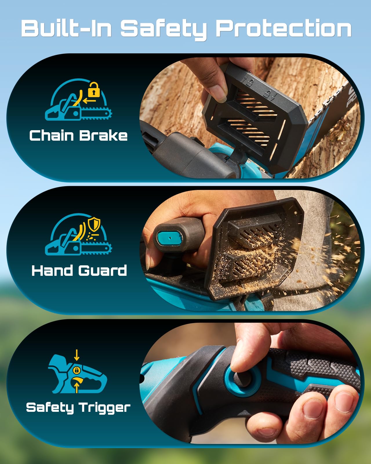 - [COMPREHENSIVE SAFETY SYSTEM] Engineered with a rapid emergency brake, an enlarged hand guard, and a dual-action safety switch, this battery operated chainsaw stops instantly in kickback situations. Combined with the included premium safety gear, you can tackle aggressive cutting tasks with these reliable power tools with confident control