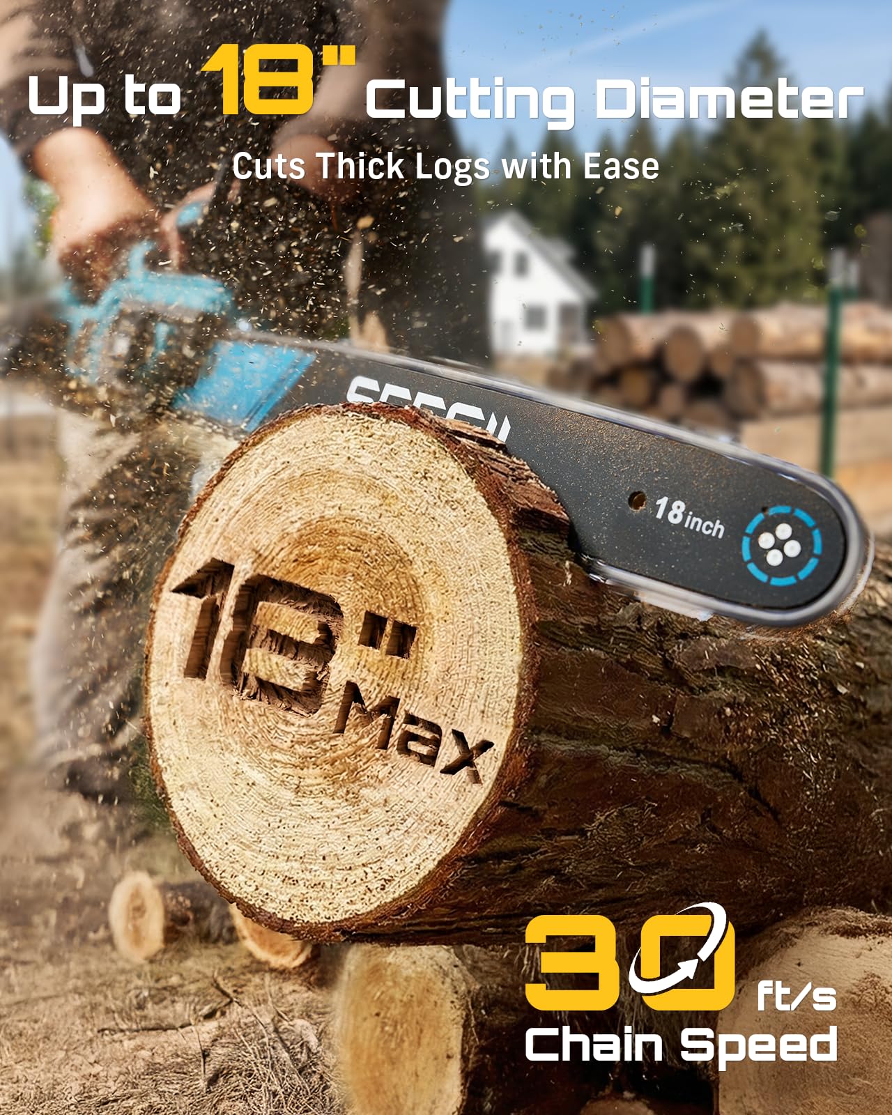 Built for the Big Jobs Equipped with a professional-grade 18 inch chainsaw bar, this chain saw effortlessly handles massive logs that smaller models simply cannot reach. To ensure your workflow remains uninterrupted, we include two 5000mAh (5.0Ah) high-capacity batteries. As a complete cordless chainsaw with battery and charger kit, a single full charge supports up to 200 cuts (tested on 4-inch soft wood), allowing you to clear your entire property in one go.