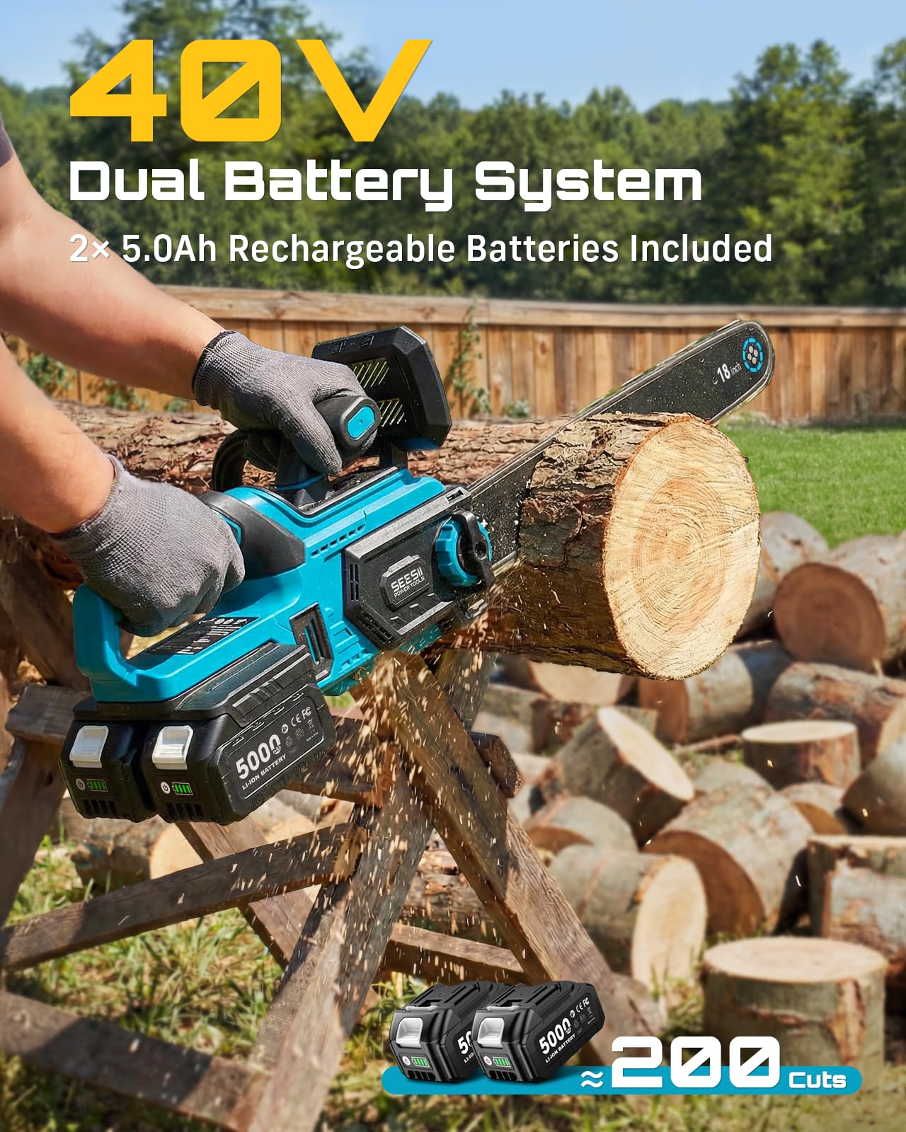 - [40V POWER & 2 x 5000mAh BATTERIES] Operating on a powerful 40V output system paired with two 5000mAh high-capacity batteries, this battery powered chainsaw provides exceptional sustained energy. As a complete cordless chainsaw with battery and charger, a single full charge delivers up to 200 cuts (tested on 4-inch soft wood logs), meaning you can clear your entire property without pausing